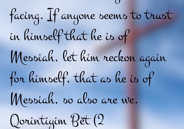 “Take a look at what you are facing. If anyone seems to trust in himself that he is of Messiah, let him reckon again for himself, that as he is of Messiah, so also are we.”