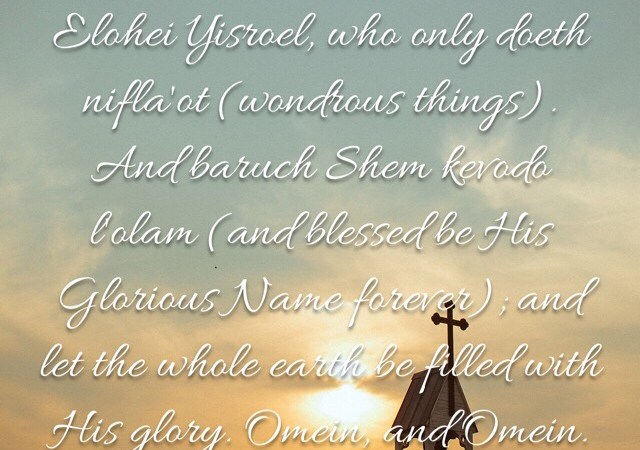 And baruch Shem kevodo l’olam (and blessed be His Glorious Name forever); and let the whole earth be filled with His glory. Omein, and Omein.”