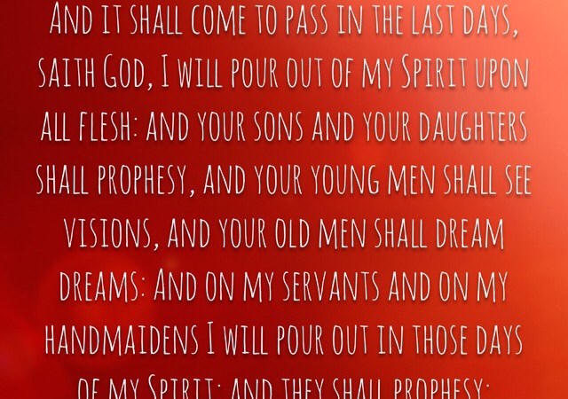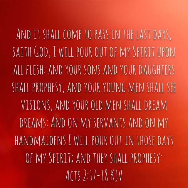 “And it shall come to pass in the last days, saith God, I will pour out of my Spirit upon all flesh: and your sons and your daughters shall prophesy, and your young men shall see visions, and your old men shall dream dreams: And on my servants and on my handmaidens I will pour out in those days of my Spirit; and they shall prophesy:”