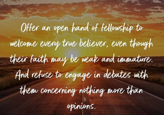 “Offer an open hand of fellowship to welcome every true believer, even though their faith may be weak and immature.