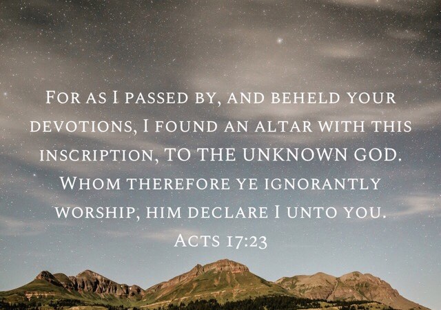 “For as I passed by, and beheld your devotions, I found an altar with this inscription, TO THE UNKNOWN GOD. Whom therefore ye ignorantly worship, him declare I unto you.”