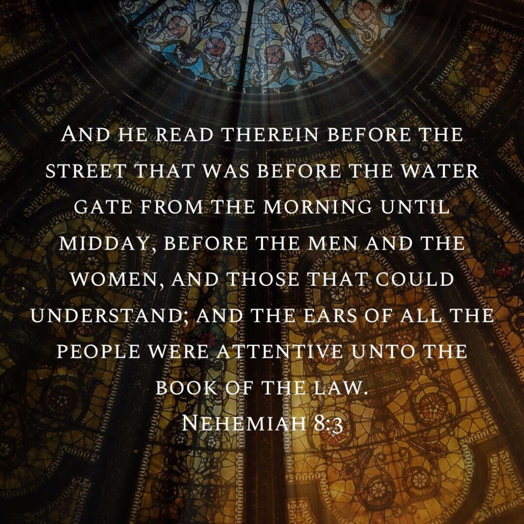 “And he read therein before the street that was before the water gate from the morning until midday, before the men and the women, and those that could understand; and the ears of all the people were attentive unto the book of the law.”