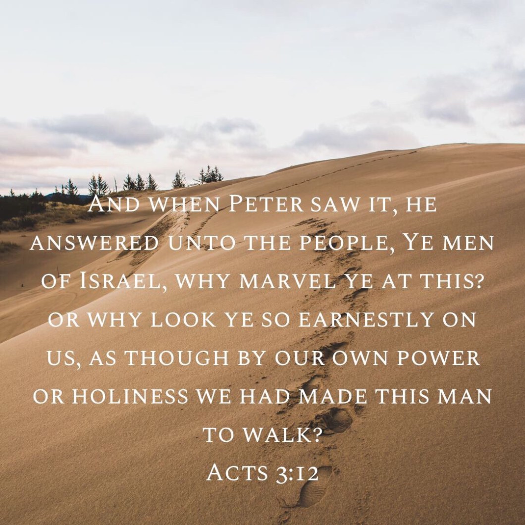 “And when Peter saw it, he answered unto the people, Ye men of Israel, why marvel ye at this? or why look ye so earnestly on us, as though by our own power or holiness we had made this man to walk?”