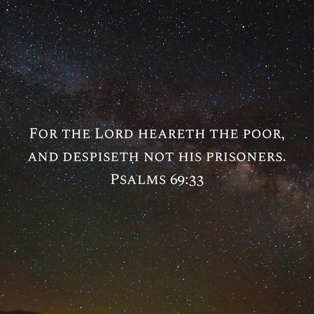 December 14, 2018 david Jesus-Works.com Verse To Day “For the Lord heareth the poor, and despiseth not his prisoners.” Psalms 69:33 KJV http://bible.com/1/psa.69.33.kjv Share this: Click to share on X (Opens in new window) X Click to share on Facebook (Opens in new window) Facebook Click to email a link to a friend (Opens in new window) Email Click to share on LinkedIn (Opens in new window) LinkedIn Click to print (Opens in new window) Print Like Loading...