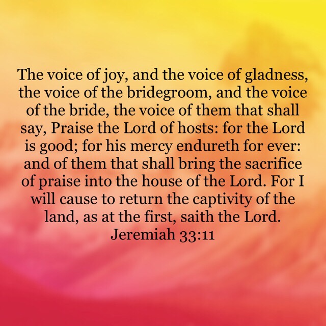 “The voice of joy, and the voice of gladness, the voice of the bridegroom, and the voice of the bride, the voice of them that shall say, Praise the Lord of hosts: for the Lord is good; for his mercy endureth for ever: and of them that shall bring the sacrifice of praise into the house of the Lord. For I will cause to return the captivity of the land, as at the first, saith the Lord.”