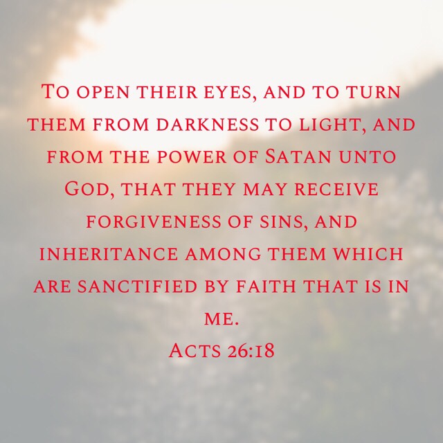 “To open their eyes, and to turn them from darkness to light, and from the power of Satan unto God, that they may receive forgiveness of sins, and inheritance among them which are sanctified by faith that is in me.