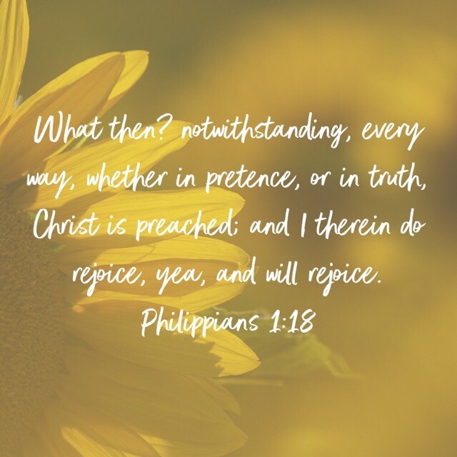 “What then? notwithstanding, every way, whether in pretence, or in truth, Christ is preached; and I therein do rejoice, yea, and will rejoice.”