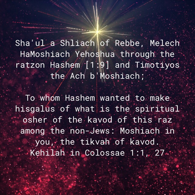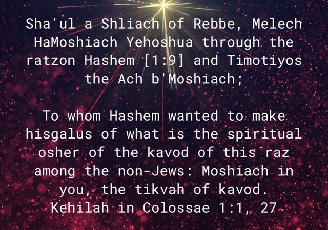 “Sha’ul a Shliach of Rebbe, Melech HaMoshiach Yehoshua through the ratzon Hashem [1:9] and Timotiyos the Ach b’Moshiach;