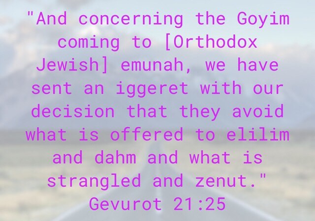 “And concerning the Goyim coming to [Orthodox Jewish] emunah, we have sent an iggeret with our decision that they avoid what is offered to elilim and dahm and what is strangled and zenut.”