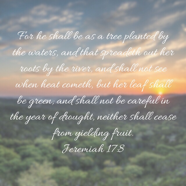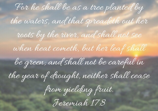 For he shall be as a tree planted by the waters, and that spreadeth out her roots by the river, and shall not see when heat cometh, but her leaf shall be green; and shall not be careful in the year of drought, neither shall cease from yielding fruit.”
