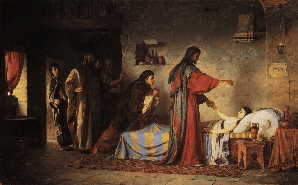 One of the three episodes in the Gospels Jesus brings a dead person back to life, the raising of Jairuss daughter follows the account of Jesus healing of the Woman with an Issue of Blood whom he had encountered while on his way to Jairuss home. Jairus had summoned Jesus to his daughters deathbed, but she was already dead when Jesus arrived. Jesus took her hand and told her to arise. The physical contact between Jesus and Jairuss daughter is not always shown in images of this *miracle; Jesus may stand over the reclining woman and gesture toward her. *Matthew (9:18-26) recounts that Jesus went alone into her room, while *Mark (5:35-43) and *Luke (8:49-56) tell that her parents and several *apostles (Peter, *James, and *John) witnessed the miracle. Hence, these additional figures may be included; Jairus may stand by the bed, and the girls mother may be shown assisting her as she sits upright. The subject is found on early Christian sarcophagi and ivories and in Romanesque and Gothic manuscripts and frescoes but is infrequent in later medieval art.