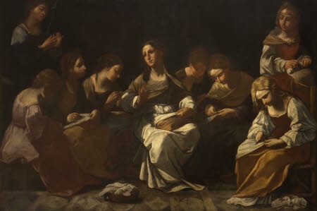 Oil painting on canvas, The Virgin and her Companions sewing the Veil of the Temple (The Education of the Virgin), after Guido Reni (Bologna 1575 – Bologna 1642). Depicts a scene with the female subject seated in the centre with her attendants about her. This is a copy of the picture of around 1640/42 in the Hermitage, St Petersburg. The veil of the temple was torn in two on the death of Jesus Christ.