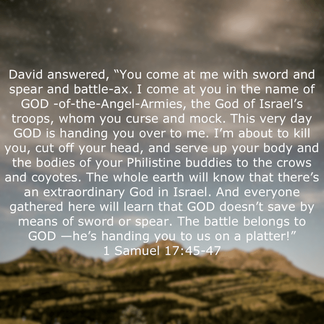 “David answered, “You come at me with sword and spear and battle-ax. I come at you in the name of GOD -of-the-Angel-Armies, the God of Israel’s troops, whom you curse and mock. This very day GOD is handing you over to me. I’m about to kill you, cut off your head, and serve up your body and the bodies of your Philistine buddies to the crows and coyotes. The whole earth will know that there’s an extraordinary God in Israel. And everyone gathered here will learn that GOD doesn’t save by means of sword or spear. The battle belongs to GOD —he’s handing you to us on a platter!””